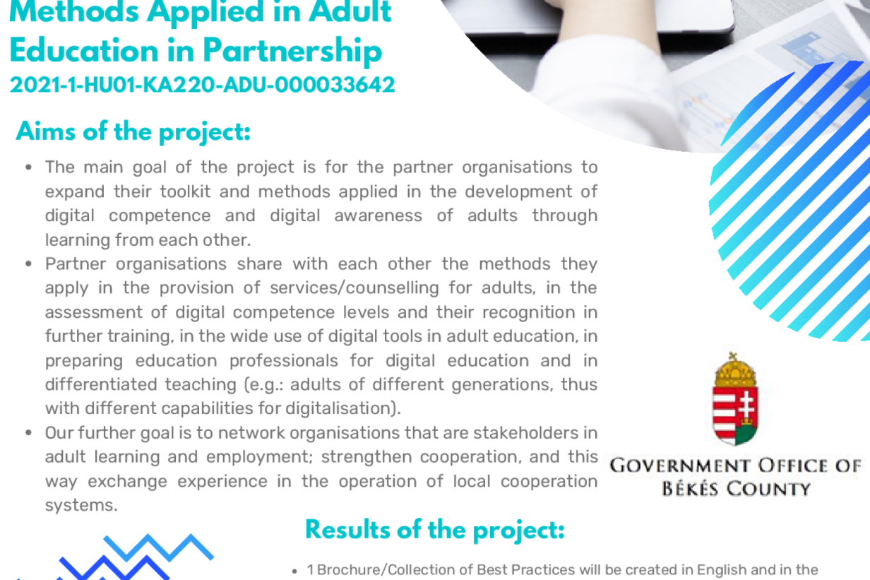 The Government Office of Békés County, in collaboration with Ferenc Gál University, János Kodolányi University, and partner organizations from Germany, Estonia, Spain, and Romania, implemented Erasmus+ project no. KA2 2021-1-HU01-KA220-ADU-000033642 titled "MAP - Mapping Digital Methods Applied in Adult Education in Partnership", aimed at exchanging best practices in adult education.