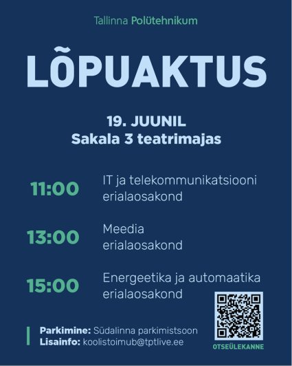 - kell 15.00 Energeetika ja automaatika erialaosakonna lõpuaktus.